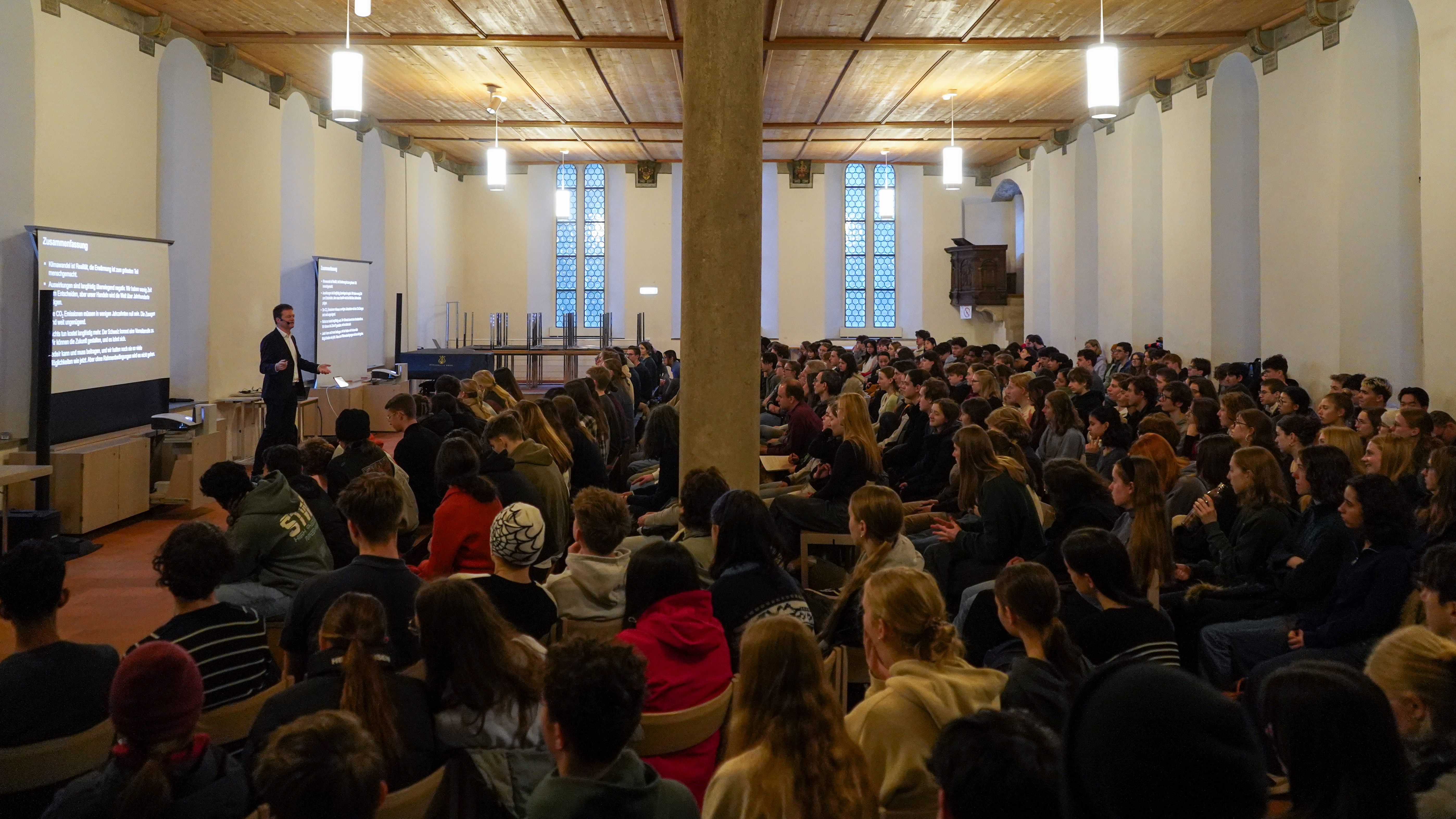 Nach einleitenden Worten des Rektors Paul Zübli begann der Tag mit einem gemeinsamen Auftaktvortrag von Prof. Reto Knutti, einem führenden Klimaforscher der ETH. In seiner eindrücklichen Präsentation zur Klimaveränderung vermittelte er sowohl den Ernst der Lage als auch mögliche Lösungsansätze – und machte deutlich, wie wichtig wissenschaftliches Denken und verantwortungsvolles Handeln sind.