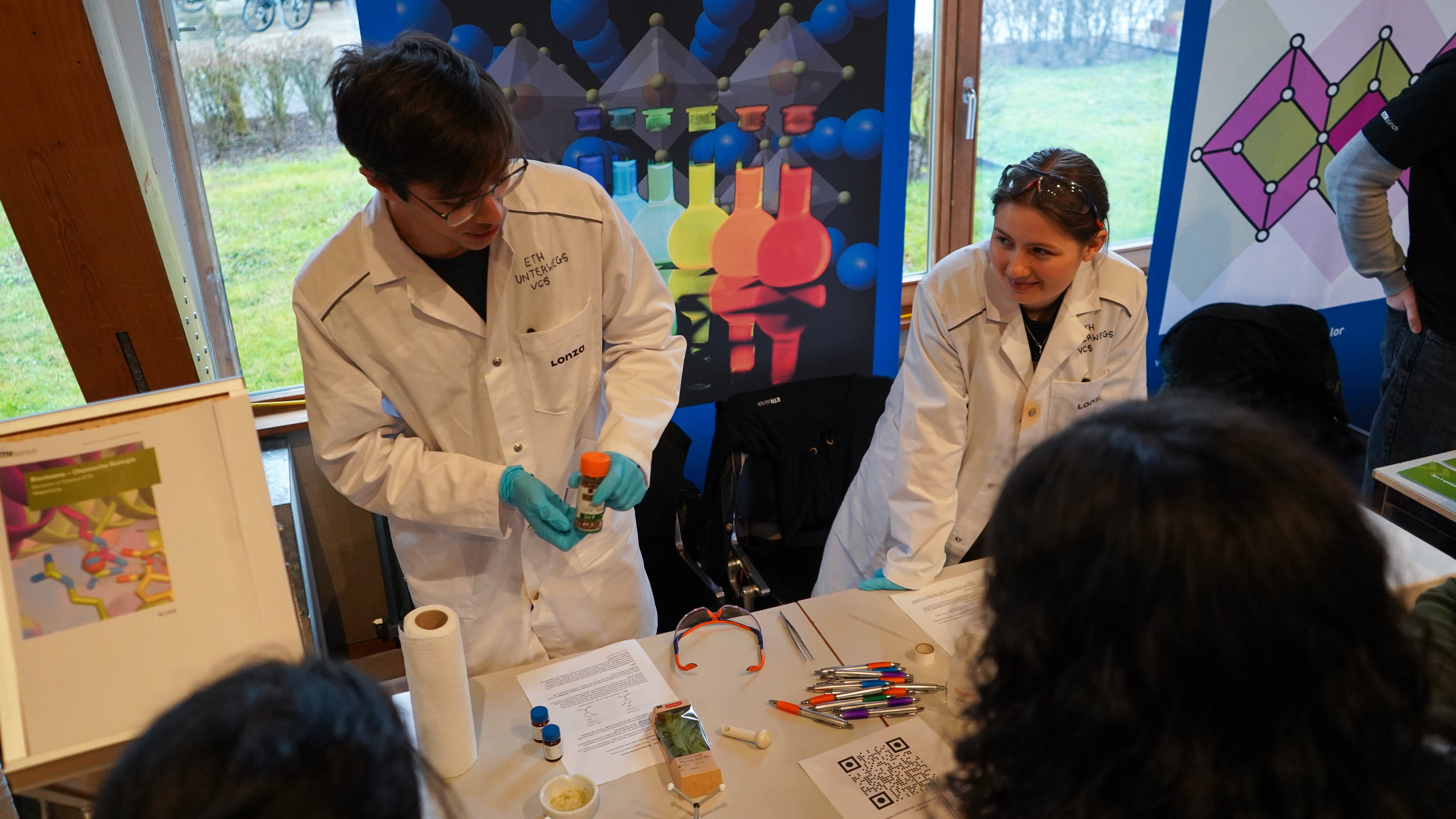 Anschliessend konnten die Schülerinnen und Schüler aus einem breiten Angebot an Workshops und Vorträgen wählen. Die Themen waren vielfältig. Sie reichten von der Forschung an innovativen Krebstherapien mit intelligenten Radio-Pharmaka über Knoten in der Mathematik bis hin zu Brückenbauprojekten, Systembiologie und den Möglichkeiten einer nachhaltigen Raumplanung. Parallel dazu präsentierten Studierende der ETH ihre eigenen Projekte in einer naturwissenschaftlichen Ausstellung – anschaulich und inspirierend. Besonders freute es uns, dass unter den Studierenden viele ehemalige Schülerinnen und Schüler waren, die nach der KSWE den Weg an die ETH gefunden hatten.