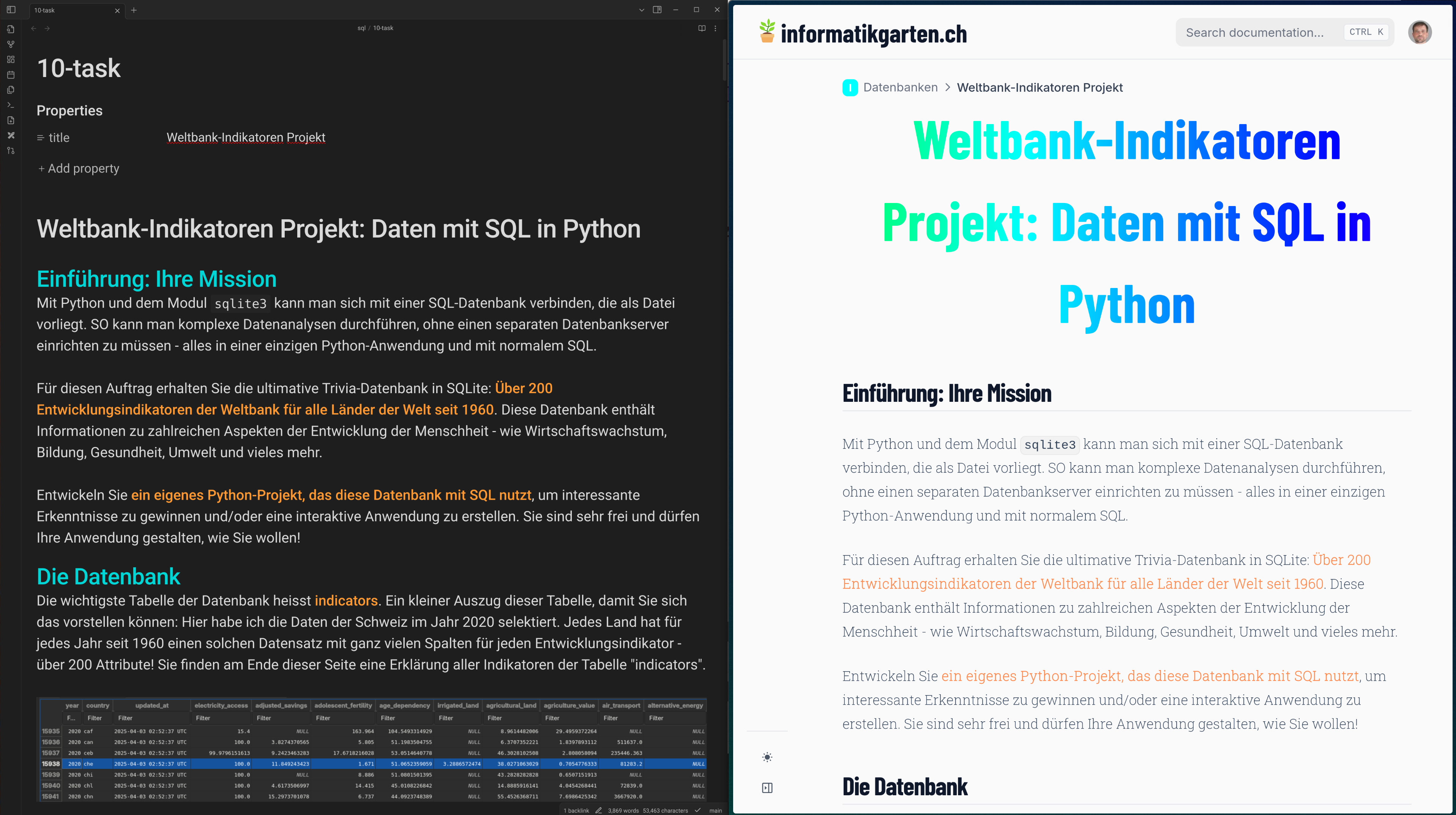 Links: Inhalte in Obsidian, rechts: die Webseite