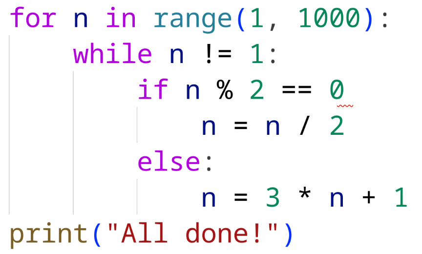 Was ich dabei im Unterricht zu vermitteln versuche, ist ein offener Umgang mit dem Umstand, dass unsere mentale Kapazität beschränkt ist. Es ist völlig normal, dass man ohne Übung und ohne Hilfe einen fehlenden Doppelpunkt auf Linie 22 übersieht. Man muss Strategien und Hilfsmittel finden, um seine wertvolle Kopfarbeit fokussiert einsetzen zu können. Deswegen verwenden wir professionelle Programmierwerkzeuge, die ähnlich einer Rechtschreibprüfung solche Syntaxfehler rot markieren.