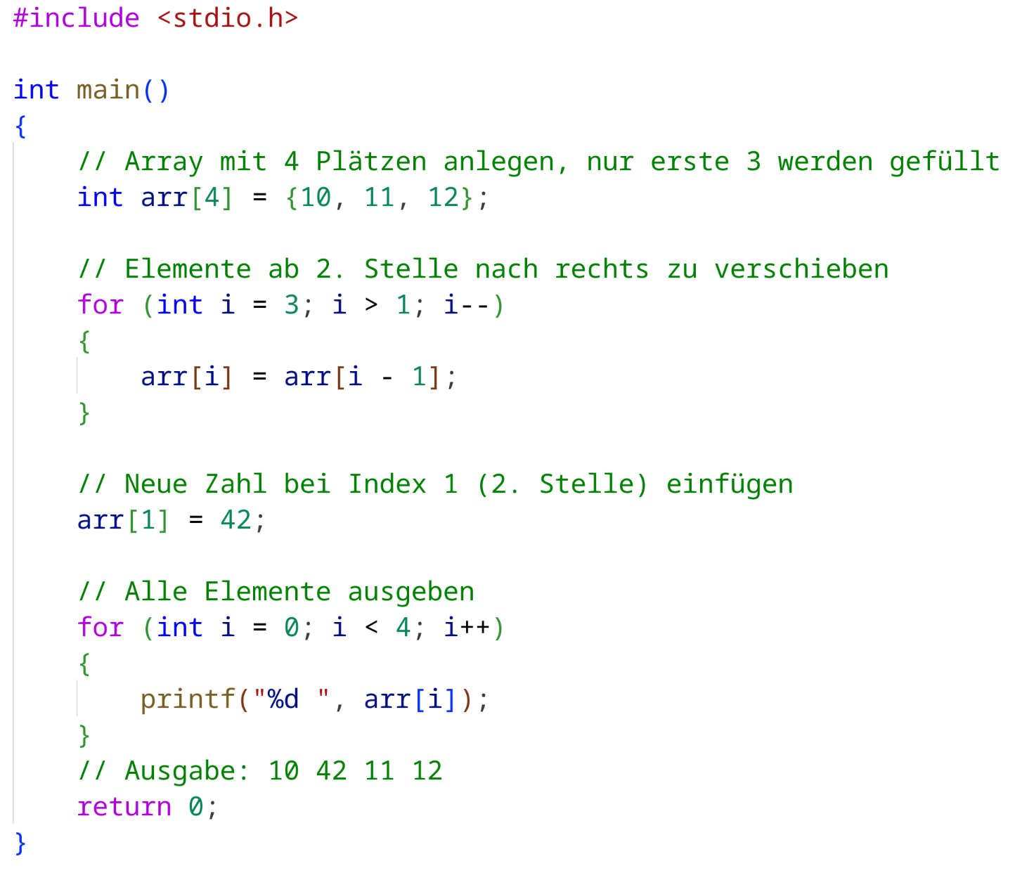 In C müssen wir hingegen weit mehr Instruktionen schreiben, um dem Computer genau zu sagen, wie er das tun soll (nach // in grün stehen Kommentare zum Verständnis):