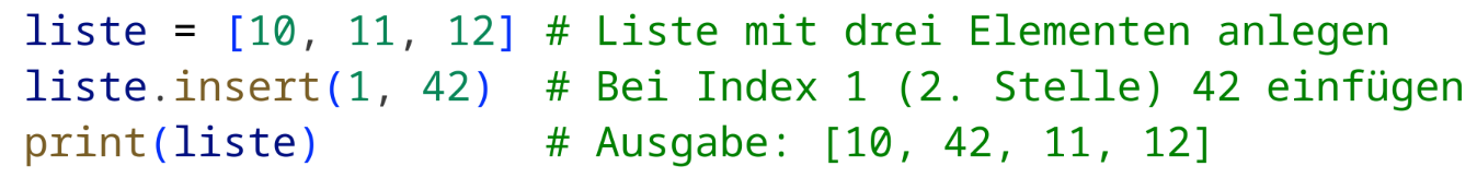 In Wettingen lernen wir im Grundjahr Informatik Python. Vergleichen wir ein Miniprogramm in Python und in C: Wir wollen die Zahlen 10, 11 und 12 in einer Liste speichern, dann zwischen 10 und 11 die Zahl 42 einfügen, und das Resultat in der Konsole ausgeben.