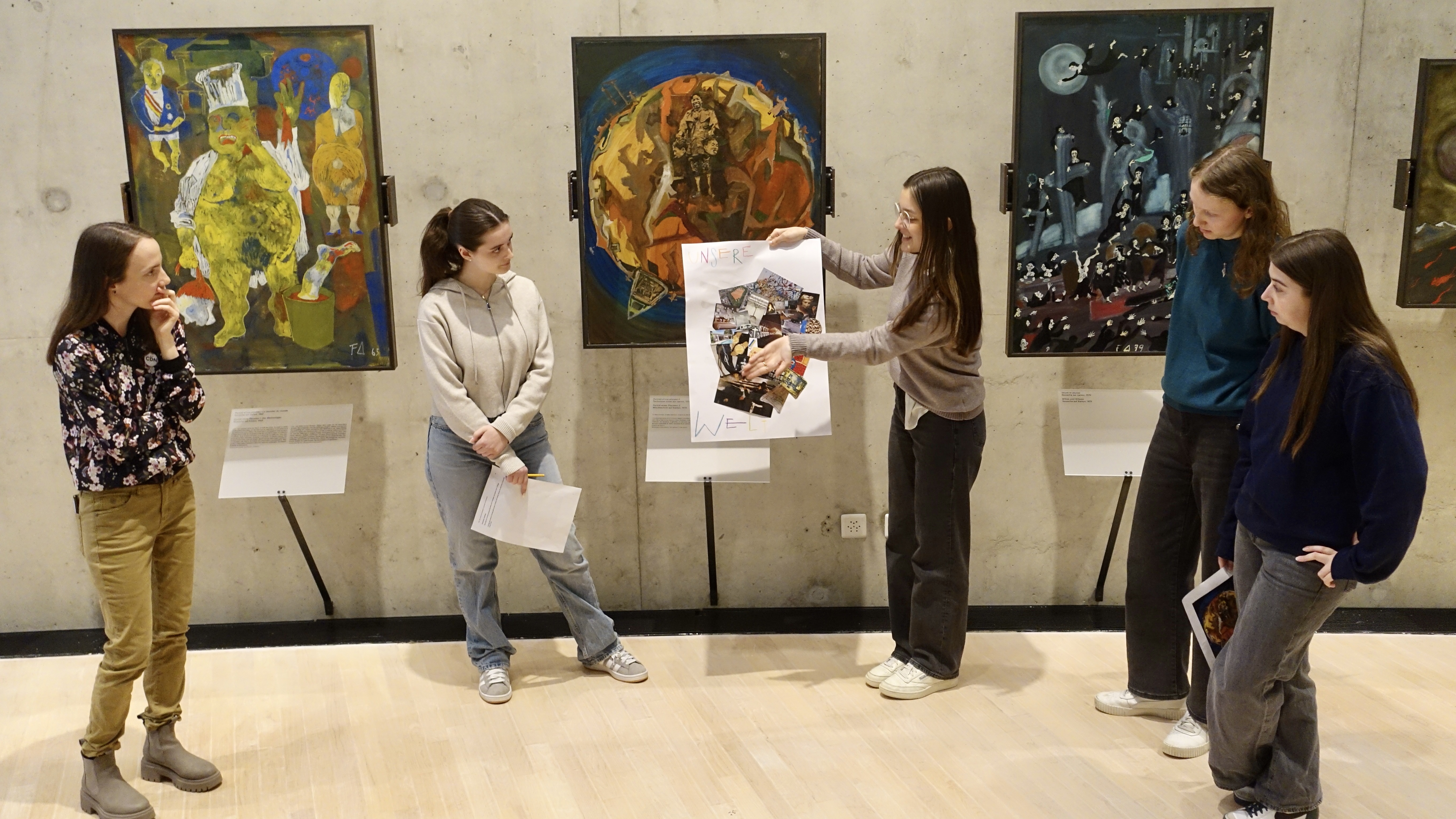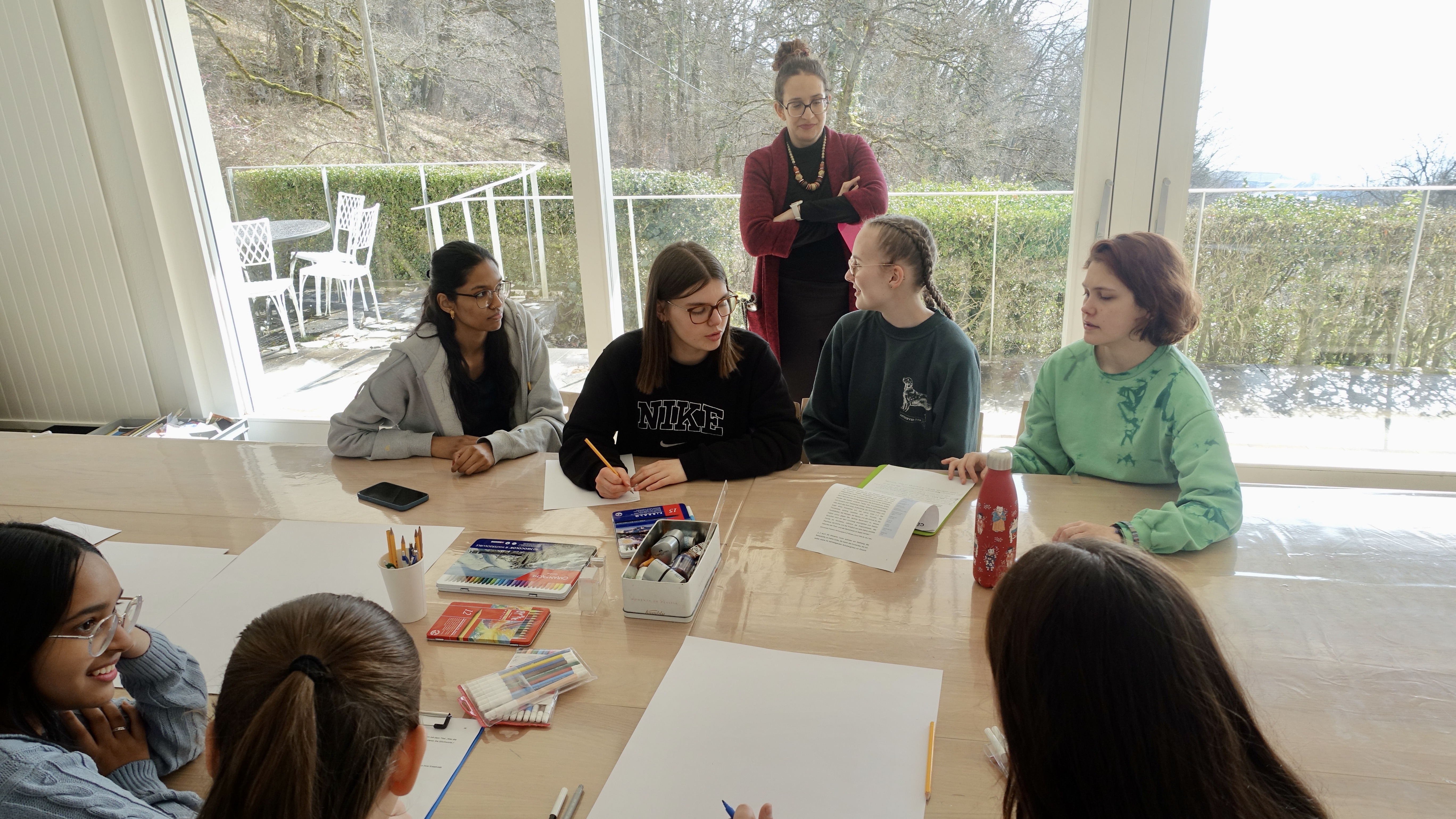 Im Museum bekamen wir zuerst eine kleine Führung durch das ehemalige Haus des Schriftstellers. Dort sind das originale Schreibzimmer und das Bad von Dürrenmatt zu sehen. In seinem Schreibzimmer befinden sich ausschließlich deutschsprachige Bücher und das stille Örtchen ist mit bunten abstrakten Malereien versehen, die Dürrenmatt selbst kreiert hat. Hinter dem Haus liegt eine Terrasse mit Blick auf Neuchâtel und den See. Nach dem Museumbesuch gab es einen Workshop, bei dem wir zu Themen, die zu Dürrenmatts Gemälden passten, arbeiteten.